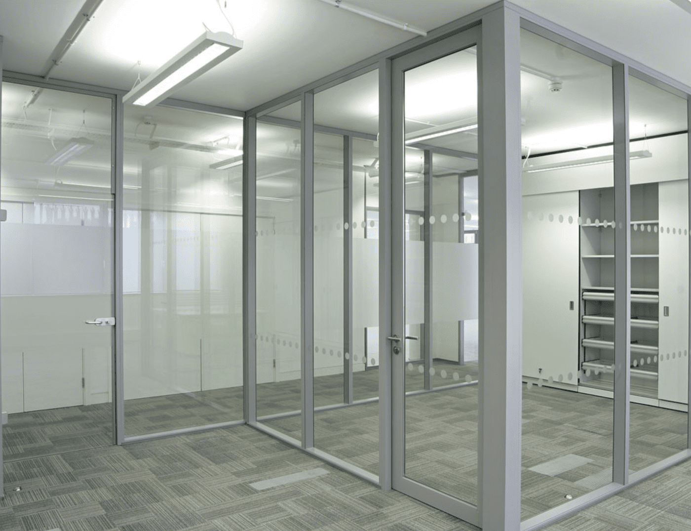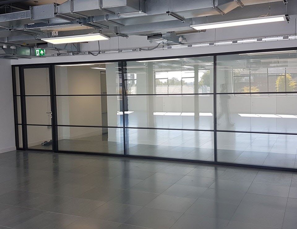 Inspired by modern and minimalist design, a black framed glass door creates a stunning contrast to the glass office panels. This door integrates seamlessly into the Transverso™ Monoblock Modular Partition System. This double glazed modular partition system creates a smaller workspace where noise is reduced, yet it feels like part of the larger office.