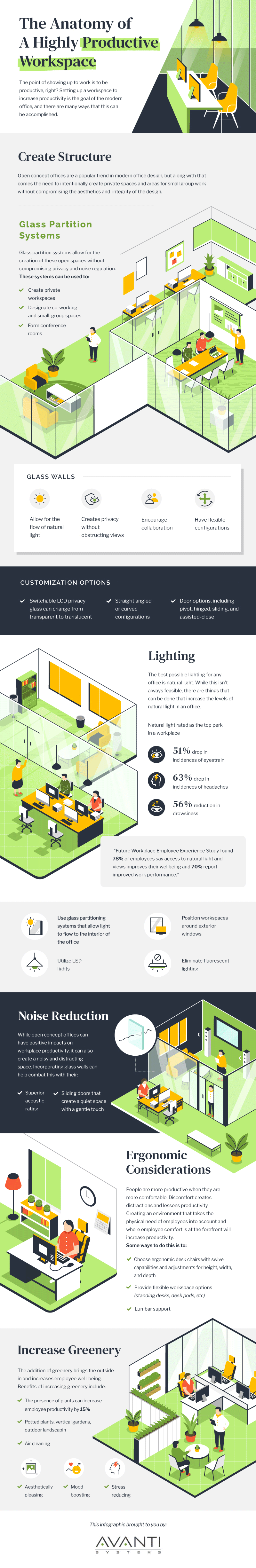 With more workers gradually returning to a traditional office setting, the transition from remote working into an on-site position might be a shock to the senses for some employees. During these times of change, it is important for companies to create workplace settings that encourage efficiency and improve productivity while abiding by social distancing preferences. A workspace that ticks these boxes requires improved structure, lighting, noise reduction, ergonomic features, and the addition of organic components. Discover the details of how a workspace can improve productivity through architecture and design with the below infographic.