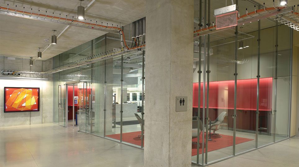 The University of Iowa School of Music incorporates multiple Avanti partition systems. The Solare™ Single Glazed Partition System with Timber doors is used in the Office Suites. Glazing for the offices is 3/8” thick and is white, frosted, opaque gradually changing to clear. The Reception Area uses the Solare™ Double Glazed Partition System (1/2” glazing thickness for at both panes) and a Single Glazed Door with Ladder Pull Hardware (glazing for doors 1/2″). Due to the height of the transom above the Reception Area doors, horizontal structural steel support was included in the design. Horizontal structural steel support is also installed at the Recital Hall and Sound Lock transoms. Due to the immense height of the Music Library and Rehearsal Concourse glazing, the Elevare™ Stacking Double Glazed High Wall System works perfectly for these situations. The Aluminum Framework was finished with the RAL 9006 Metallic Silver Powder Coating, while the Door Fittings and hardware had a brushed stainless steel finish.