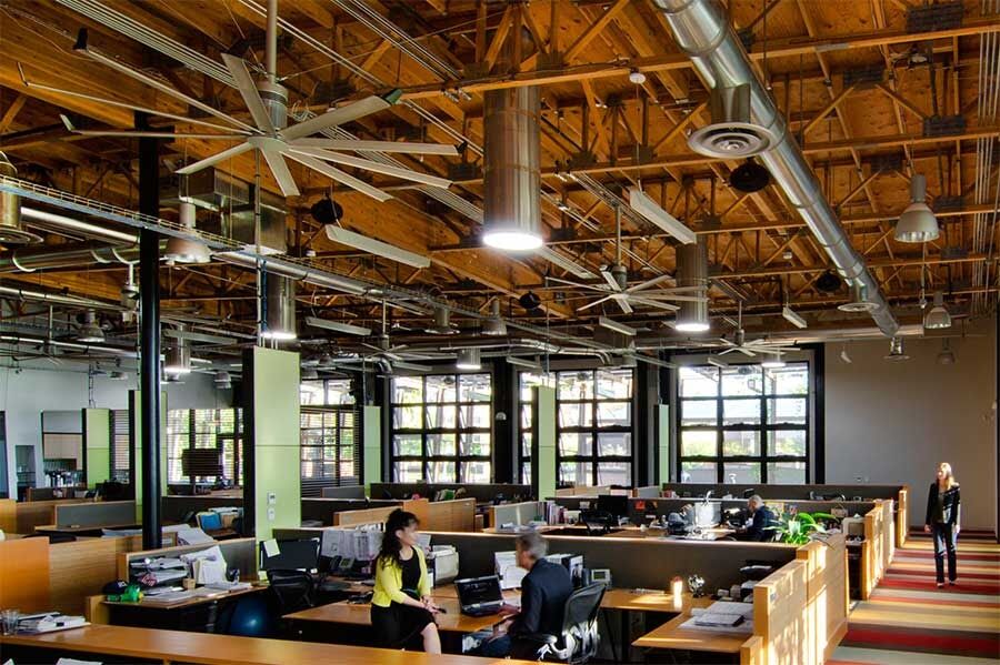 Whether you’re starting from scratch or reimagining an existing space, nodding to the open plan factories of the past brings an interesting element to a modern office design. The juxtaposition of today’s white collar work and the factory work that used to take place in these spaces brings depth to the design. Industrial elements like exposed ductwork and beams and large fans create an invigorating work environment.