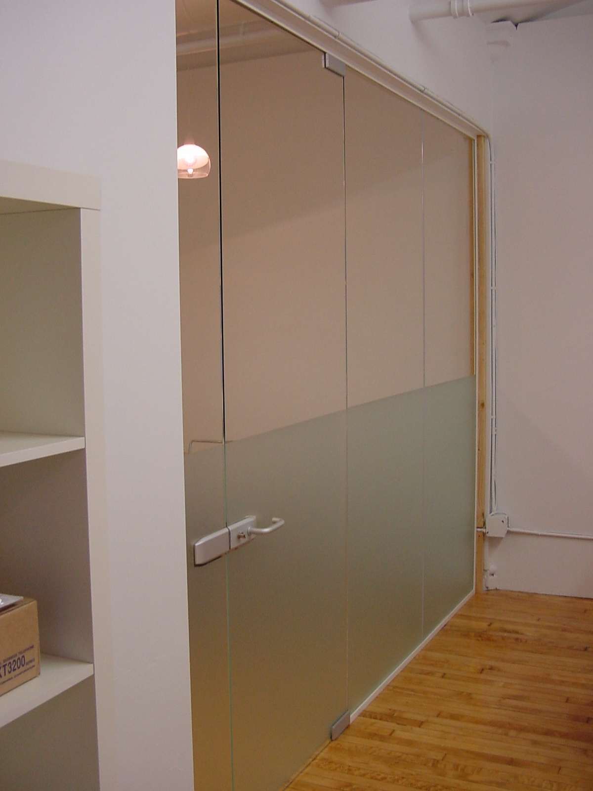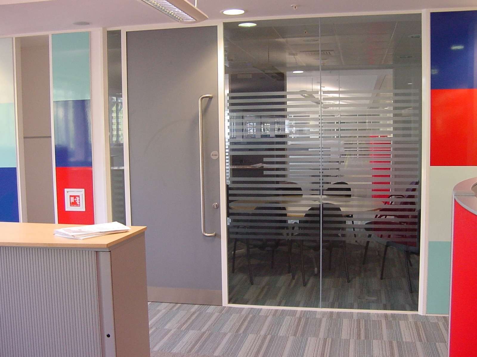In other areas of the office, additional privacy was necessary, so the frameless glass partitions were frosted to half-height and carried continuously onto the Hinged Framed Swing door which fits seamlessly into this glass partition system. They are offered in free swing and self-closing options.