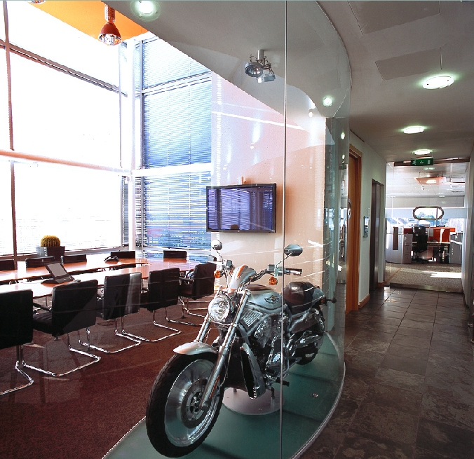 The full height Solare™ Acoustic Single Glazed Partition System was chosen for the conference room and installed in a curved configuration. Choosing a curved glass wall partition allowed for enough space to include a Harley-Davidson motorcycle, enhancing the feel of the conference room and integrating the company culture.