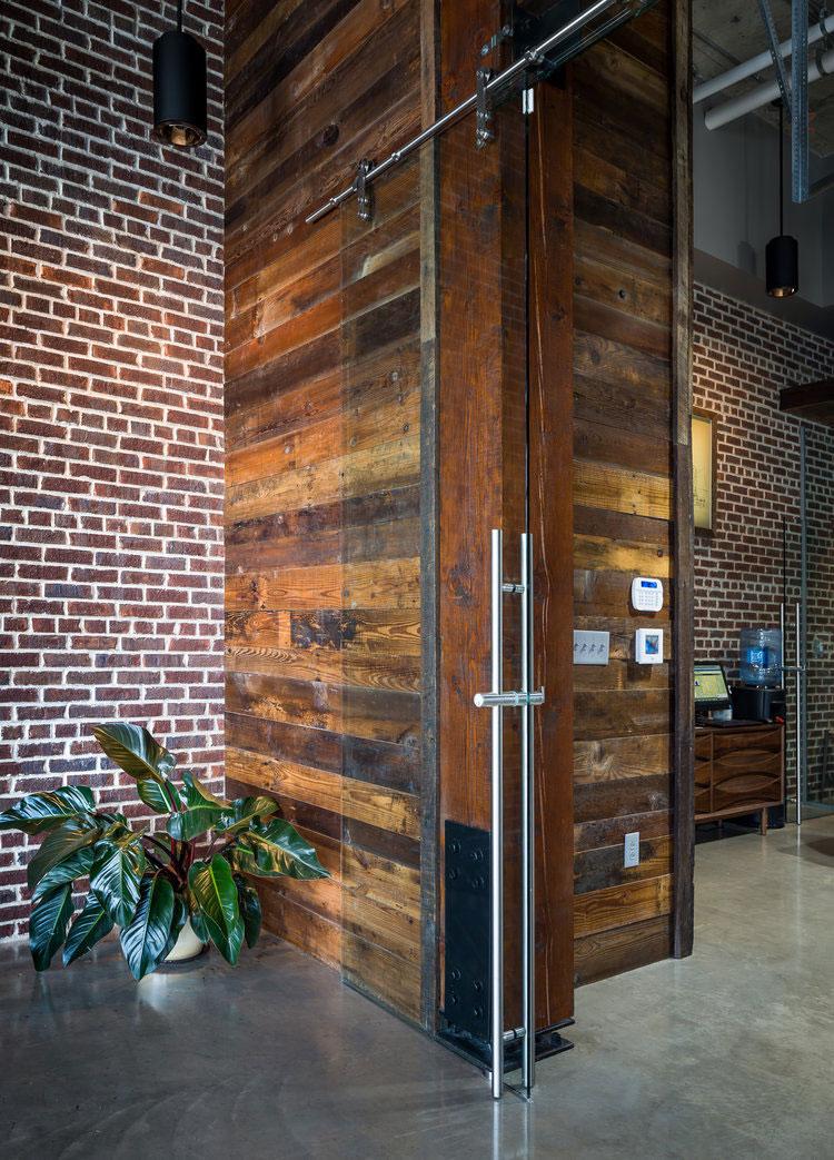 Remington Row chose wood planked walls on one side of the entry and glass partition panels on the other. The rustic inspired wood planked wall stands in beautiful contrast to the modern glass barn doors that slide smoothly on their tracks.
