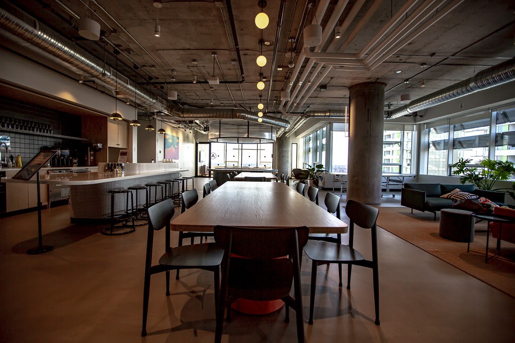 The darker, brooding colors used in this industrial coworking space design inspire contemplative thought and a desire to get to the serious work. Exposed pipes and ductwork in the ceiling along with the windows that surround the entire area give the coworking space design layout an open feel that encourages collaboration and an open exchange of ideas.